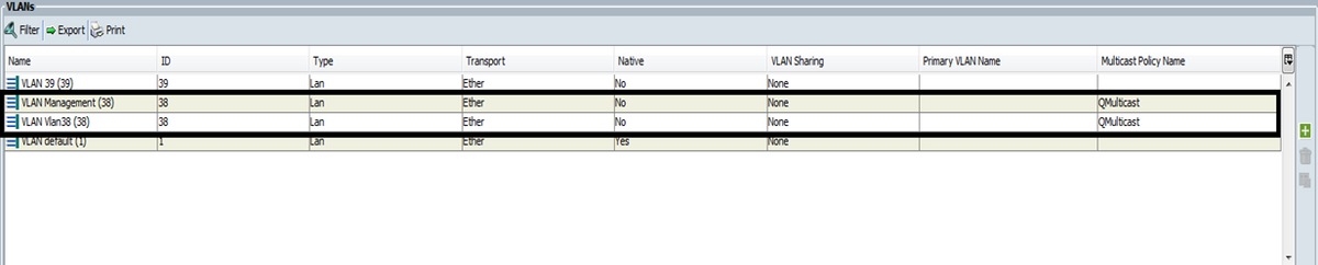 Si crea varios objetos VLAN, que apuntan al mismo ID de VLAN, entonces, cuando aplica una política Multicast, se aplica a todos los objetos VLAN con el mismo ID de VLAN. La última política de multidifusión aplicada se aplica a todos. Por ejemplo: QMulticast cambiado a Snoop_off_qu_off (Vlan 38).