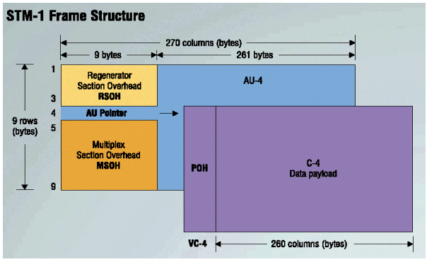Este diagrama muestra la estructura de trama del nivel 1 (STM1) del Módulo de transporte síncrono.