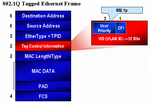 El siguiente diagrama es una trama Ethernet con etiqueta con un campo 802.1Q que consiste de un Ethertype de dos bytes y una etiqueta de dos bytes. Dentro de la etiqueta de dos bytes se encuentran los bits de prioridad del usuario (conocidos como 802.1p).