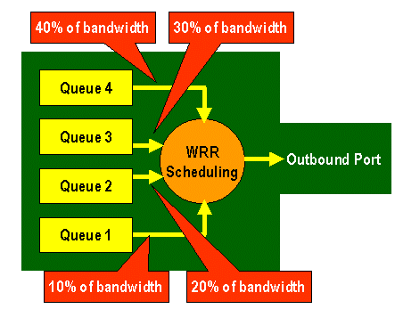 WRR se utiliza para programar tráfico de egreso desde colas TX. Un algoritmo de ordenamiento cíclico alternará entre colas TX enviando una cantidad equivalente de paquetes desde cada cola antes de pasar a la cola siguiente. El aspecto ponderado de WRR permite que el algoritmo de programación inspeccione una carga asignada a la cola. Esto permite acceso de colas definidas a más del ancho de banda. El algoritmo de programación WRR vaciará más datos de las colas identificadas que de otras colas y, por consiguiente, proporcionará una polarización para las colas designadas.