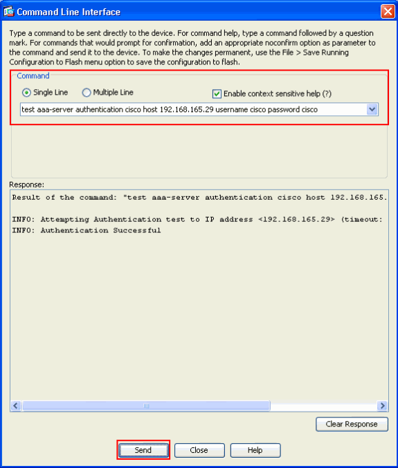 Utilice el comando test aaa-server authentication cisco host 192.168.165.29 username cisco password cisco para verificar si la configuración funciona correctamente. Esta imagen muestra que la autenticación es exitosa y que el usuario que se conecta al ASA ha sido autenticado por el servidor ACS.