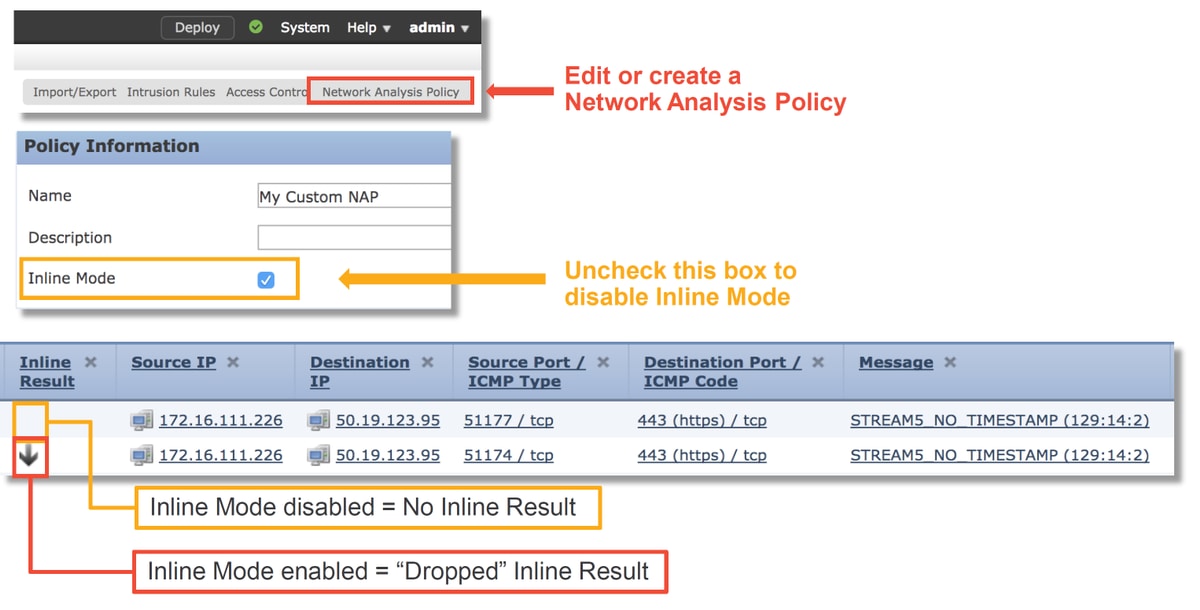 Como se puede ver en la ilustración anterior, los NAP contienen una función "Modo en línea", que equivale a la opción "Descartar cuando en línea" de la política de intrusiones. Un paso de mitigación rápido para evitar que el NAP descarte tráfico sería desmarcar el modo en línea. Los eventos de intrusión generados por el NAP no muestran nada en la pestaña Resultados en línea con Modo en línea desactivado.