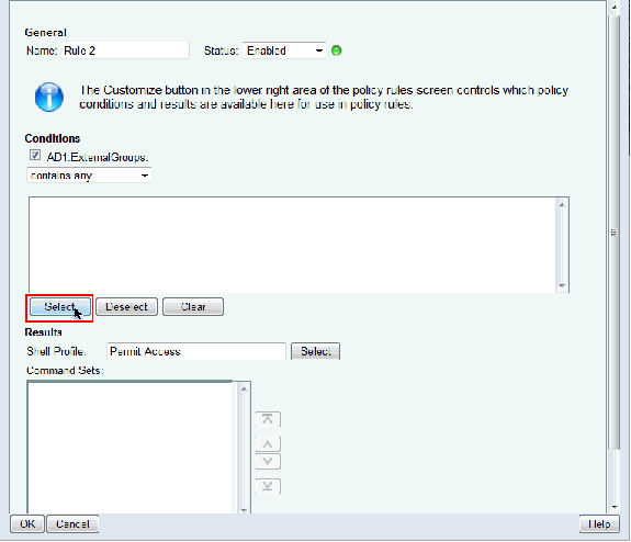 Copie AD1:ExternalGroups de la sección Available a Selected de Customize Conditions y luego mueva el perfil de shell y los conjuntos de comandos de la sección Available a Selected de Customize Results. Ahora haga clic en Aceptar.