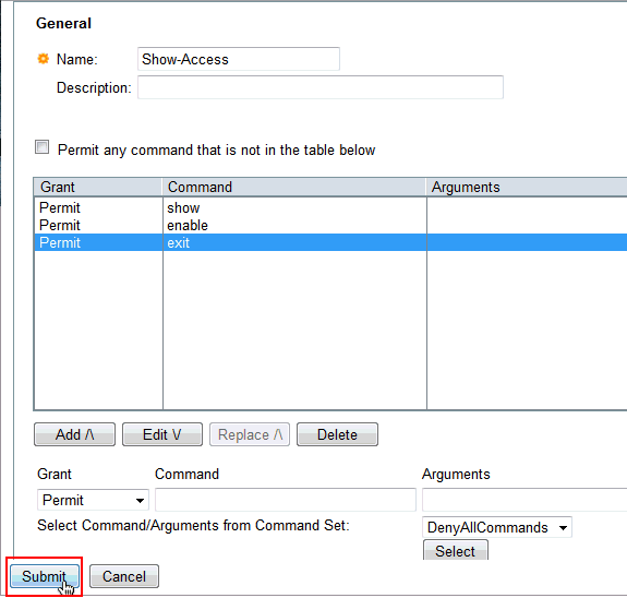 De manera similar, agregue cualquier otro comando que se permita para los usuarios en el grupo de acceso limitado con el uso de Add. Haga clic en Submit (Enviar).