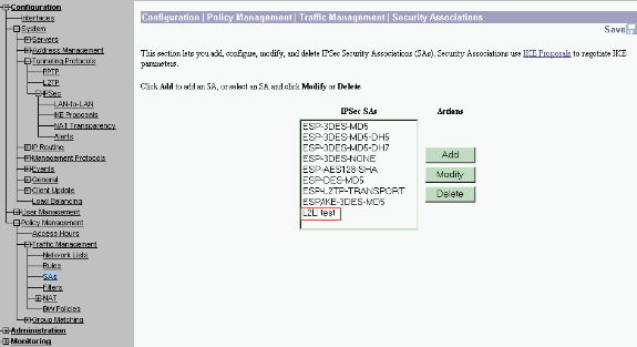 Seleccione Configuration > Policy Management > Traffic Management > Security Associations para verificar si los parámetros de SA son correctos.