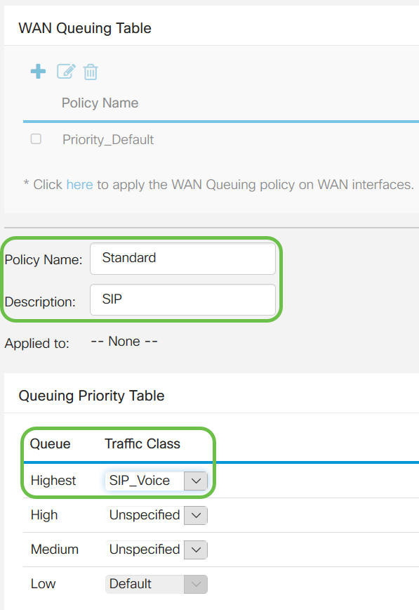 Seleccione la política de cola saliente que se aplicará a la interfaz WAN. |