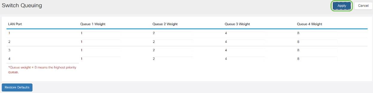 Paso 3. En Colocación en cola del switch, seleccione el peso adecuado para cada una de las colas.