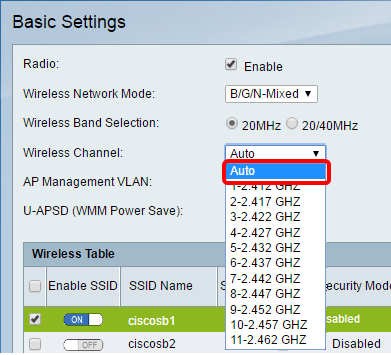 Nota: La selección de Auto permite que el router cambie automáticamente la frecuencia inalámbrica al canal menos congestionado. Si la red tiene muchos dispositivos en la frecuencia de 2,4 GHz, se recomienda elegir el canal 1-2,412 GHz o 11-2,462 GHz. La mayoría de los puntos de acceso de nivel de consumidor establecen de forma predeterminada el canal 6. Al elegir entre 1-2,412 GHz o 11-2,462 GHz, se eliminan las posibles interferencias entre los dispositivos. El canal varía ligeramente en el rango de frecuencia y velocidad. Si elige la frecuencia más baja, tendrá un alcance inalámbrico más largo pero una velocidad más lenta. Si tiene una frecuencia más alta, tendrá un alcance inalámbrico más corto pero una velocidad más rápida. En este ejemplo, el canal inalámbrico se deja en Auto (Automático), que es también el parámetro predeterminado.