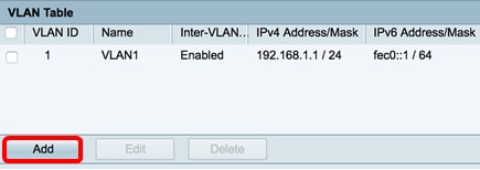 Paso 2. En la tabla VLAN, haga clic en Add para crear una nueva VLAN.
