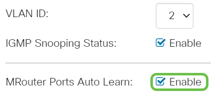 Para permitir que el router multicast detecte automáticamente los puertos conectados, marque la casilla de verificación Enable para MRouter Ports Auto Learn.