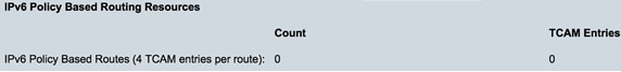 El área Rutas basadas en políticas IPv6 (4 entradas TCAM por ruta) muestra lo siguiente: