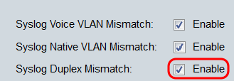 Paso 13. En el campo Discordancia dúplex de Syslog, marque la casilla Enable para enviar un mensaje syslog cuando se detecte una discordancia dúplex.