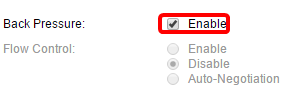 Paso 16. (Opcional) Marque la casilla de verificación Enable en el área Back Pressure para reducir la velocidad de recepción de paquetes cuando el dispositivo está congestionado. Esta función se utiliza con el modo semidúplex y desactiva el puerto remoto al evitar que envíe paquetes y bloquee la señal.