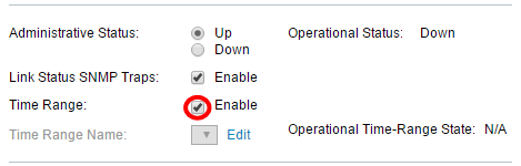 Paso 10. Elija un perfil de rango de tiempo para aplicar al puerto en la lista desplegable Nombre de rango de tiempo. Si no hay perfiles de rango de tiempo definidos, o si desea realizar cambios en uno existente, haga clic en Editar para ir a la página Rango de Tiempo. El área Estado de rango de tiempo operativo muestra si el rango de tiempo está actualmente activo o inactivo.
