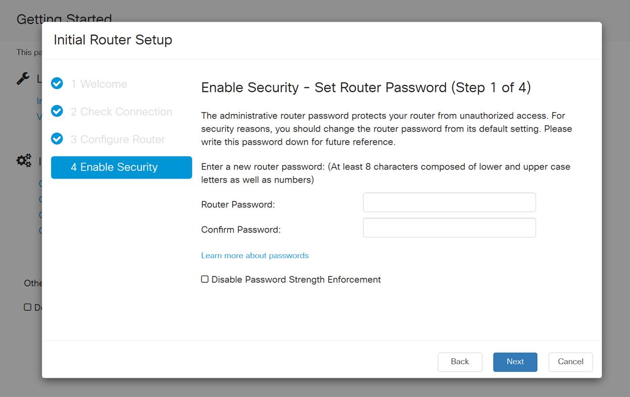Para el paso siguiente, seleccionará una contraseña que se utilizará al iniciar sesión en el router. El estándar para las contraseñas debe contener al menos 8 caracteres (mayúsculas y minúsculas) e incluir números. Introduzca una contraseña que cumpla los requisitos de resistencia. Haga clic en Next (Siguiente). Tenga en cuenta su contraseña para los inicios de sesión futuros.