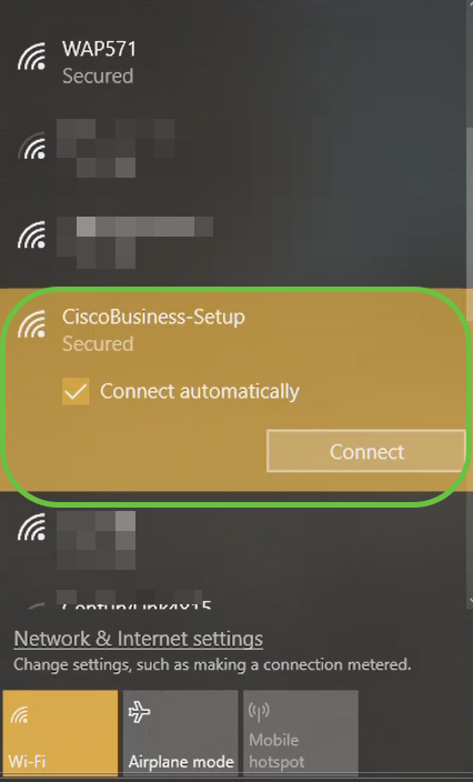 En el PC, haga clic en el icono Wi-Fi y elija la red inalámbrica Cisco Business-Setup. Haga clic en Connect (Conectar)