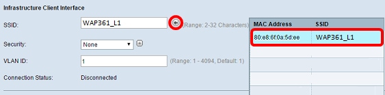 Nota: Es importante habilitar la detección de puntos de acceso no fiables. Para obtener más información sobre cómo activar dicha función, haga clic aquí. En este ejemplo, se hace clic en el botón de flecha para elegir WAP361_L1 como SSID de la interfaz de cliente de infraestructura.