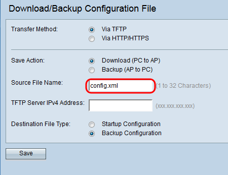 Nota: La configuración de respaldo sólo se puede descargar del servidor TFTP al punto de acceso.