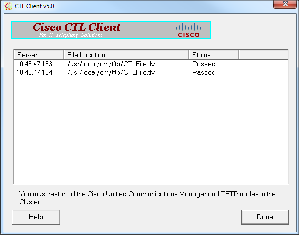 - Se muestra la lista de servidores de CUCM en los que se encuentra el archivo CTL. Haga clic en Done (Listo).