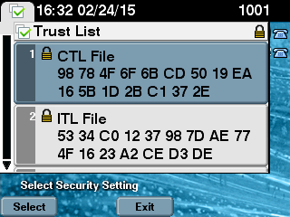 - Para verificar la suma de comprobación MD5 en el teléfono IP 7975, elija Settings > Security Configuration > Trust List > CTL File.
