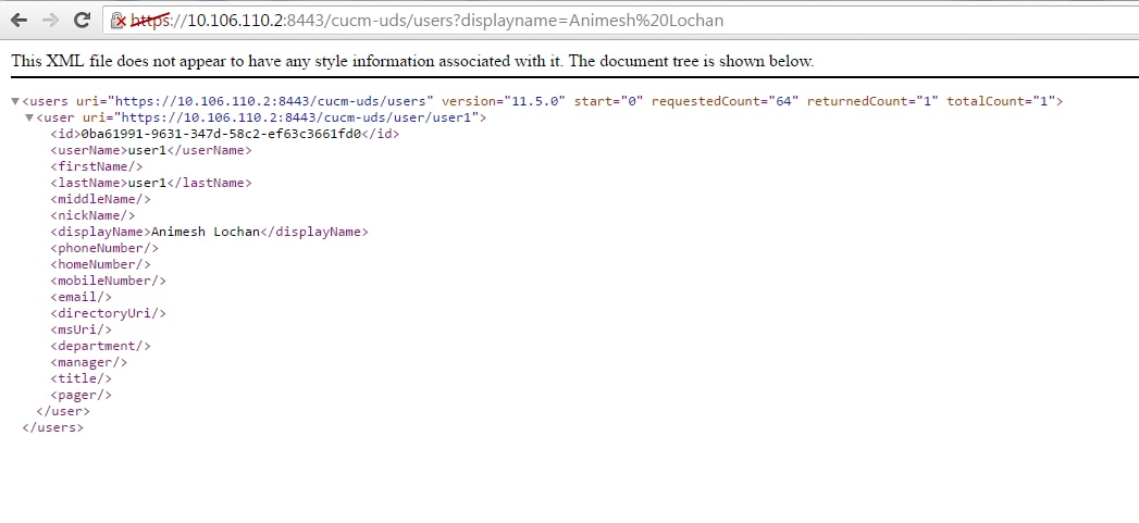 Consulte el archivo XML desde el explorador para ver un objeto User específico. Vea el archivo XML que UDS utiliza para el intercambio de datos con la URL, https://{host}:8443/cucm-uds/users?displayname="enter_text_here"