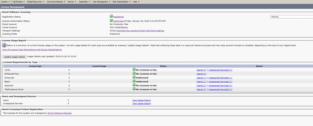 - En lugar de utilizar un servidor satélite, también puede utilizar un servidor proxy. Si CUCM ya está registrado a través del método directo o satélite, primero anule el registro y navegue hasta System > Licensing > License management. Aquí tiene la ficha Acciones, seleccioneanular registro.