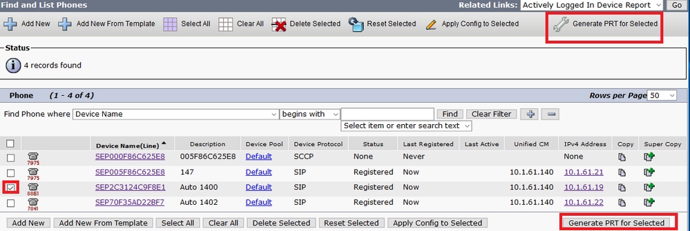 Para generar un inicio de sesión PRT en Cisco Unified Communications Manager Administration, navegue hasta CM Administration > Device > Phone, active la casilla de verificación del teléfono de interés y seleccione Generate PRT for selected, como se muestra en la imagen.