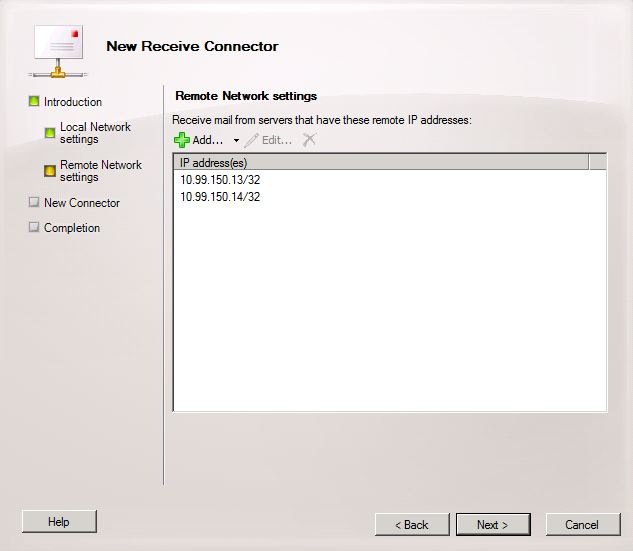 Este paso no se pudo requerir y depende de la configuración del Microsoft Exchange. El conector de la recepción permite que el servidor Exchange reciba los mensajes SMTP/e-mail de la conexión Unity y los remita hacia fuera a Internet como a correo electrónico normal. Sin esta configuración, la conexión Unity no podrá enviar los mensajes a los servicios de SpeechView en Internet.