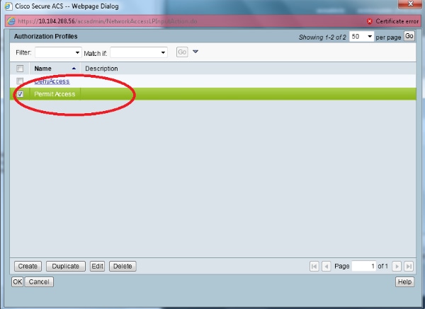 - Seleccione Elementos de política > Autorización y permisos > Acceso de red > Perfiles de autorización. Debe haber un perfil predeterminado para Permit Access (Permitir acceso).