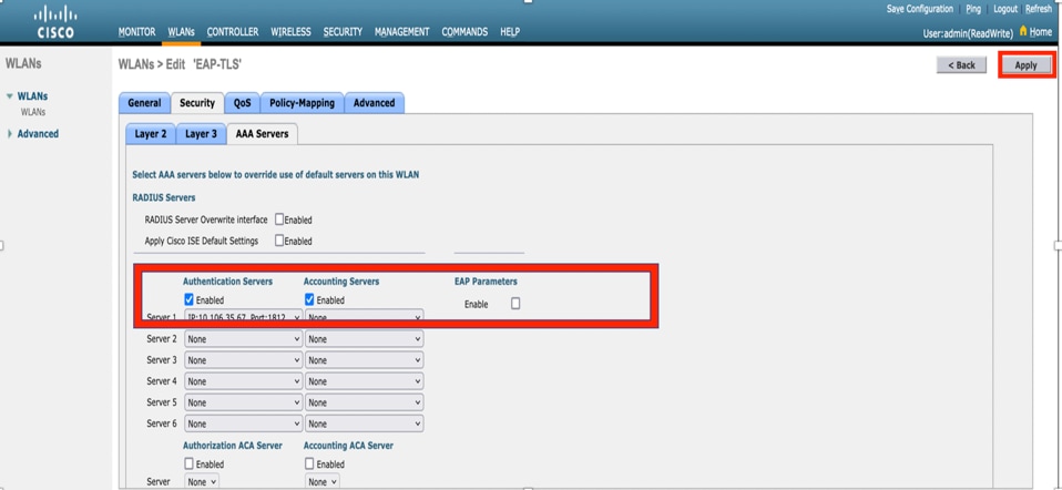 Paso 5. Asigne el nombre EAP-TLS a la nueva WLAN. Haga clic en Aplicar para continuar como se muestra en la imagen.