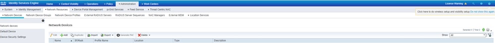 Paso 1. Abra la consola de ISE y navegue hasta Administration > Network Resources > Network Devices > Add, como se muestra en la imagen.
