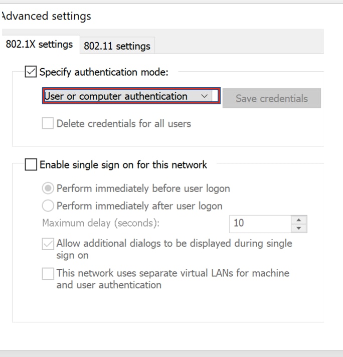 Paso 4. Haga clic en Advanced Settings y seleccione User o computer authentication en la pestaña 802.1x settings como se muestra en la imagen.