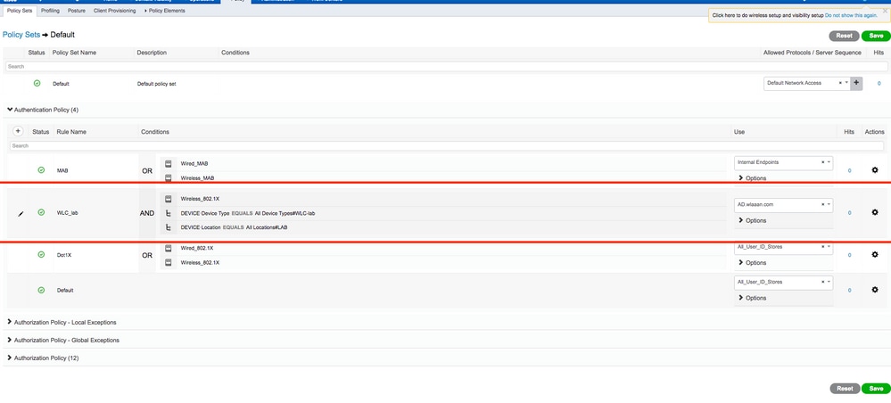 Customo modificando el conjunto deDefaultdirectivas. En este ejemplo, se modifica el conjunto de directivas Predeterminado. Desplácese hastaPolicy > Policy Sets > Default. De forma predeterminada para eldot1xtipo de autenticación, ISE va a utilizarAll_User_ID_Stores, aunque funciona incluso con la configuración predeterminada actual, ya que AD forma parte de la lista de origen de identidad deAll_User_ID_Stores, este ejemplo utiliza una regla más específicaWLC_labpara ese controlador de LAB respectivo y utiliza AD como único origen para la autenticación.