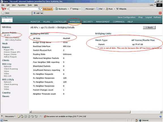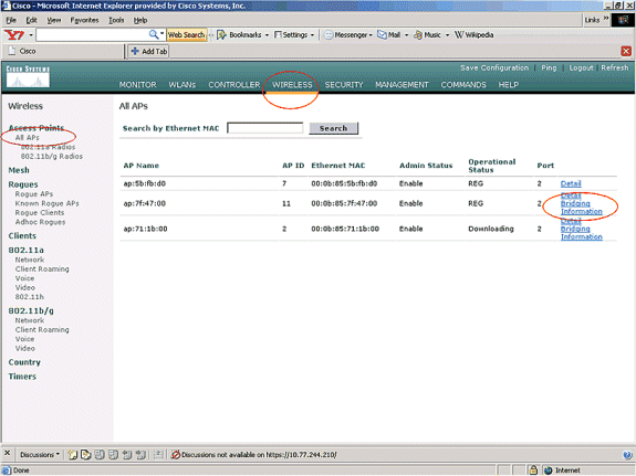 Haga clic en el enlace Bridging Information para su AP1510 para acceder a la página Bridging Information del AP.