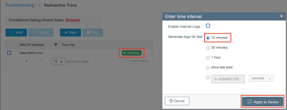 Paso 5. Haga clic en el Generate botón, seleccione el intervalo de tiempo para el que desea obtener los registros y haga clic en Apply to Device. In this example, the logs for the last 10 minutes are requested.