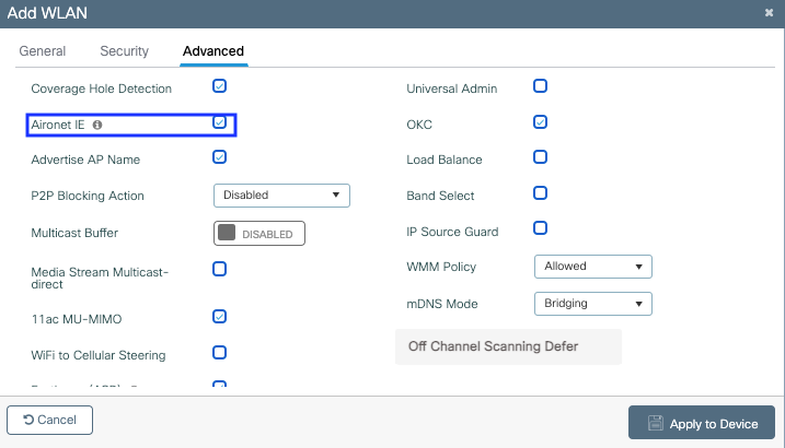 Paso 2. Vaya a la pestaña Advanced y habilite Aironet IE. Asegúrese de que el equilibrio de carga y la selección de banda estén desactivados: