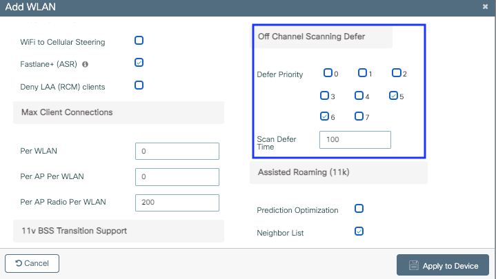 En la misma página, asegúrese de que el aplazamiento del análisis de canales fuera del canal está activado para las prioridades 5, 6 y 7. Esto evita que el AP se salga del canal durante 100ms después de que se recibió una trama con esas prioridades UP (básicamente una trama de voz).
