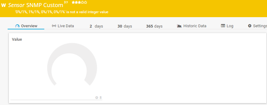 Esta integración puede requerir algunos ajustes en el lado del servidor SNMP. En este ejemplo, el servidor de supervisión PRTG se proporciona con el OID de utilización de CPU por núcleo que devuelve la cadena "0%/1%, 1%/1%, 0%/1%, 0%/1%". PRTG espera un valor entero y genera un error.