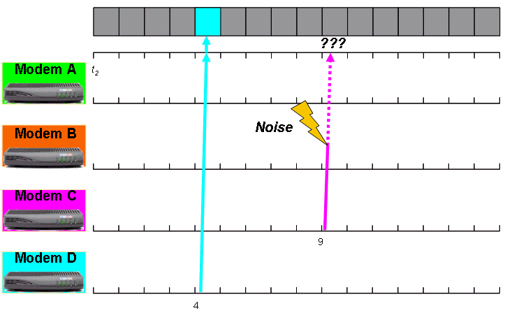 Supposons que le moment où le modem A et le modem C se rendent compte de la nécessité de retransmettre est t1. Supposons également qu'un autre modem appelé modem D décide de transmettre certaines données en amont au même moment, t1. Le modem D est sur le point de transmettre une demande de bande passante pour la première fois. Par conséquent, le modem D utilise la valeur d'origine pour le démarrage et le retour arrière des données, à savoir entre 0 et 3 [(22 - 1) = (4 - 1) = 3 intervalles].