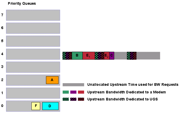 Le CMTS planifie les opportunités de demande de bande passante lorsqu'aucun autre événement n'est planifié en amont. En d'autres termes, le planificateur fournit des opportunités de demande de bande passante lorsque le planificateur en amont n'a pas prévu une subvention au meilleur effort, ou une subvention UGS ou un autre type de subvention à placer à un point particulier. Par conséquent, lorsqu’un canal en amont est fortement utilisé, les modems câble ont moins d’opportunités de transmettre des requêtes de bande passante.