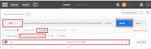 c. Définissez l'URL de l'enregistreur en envoyant un PUT avec https://<Callbridge_IP>:445/api/v1/recorders/<enregisterid> et ajoutez-le dans CORPS avant d'exécuter le PUT :