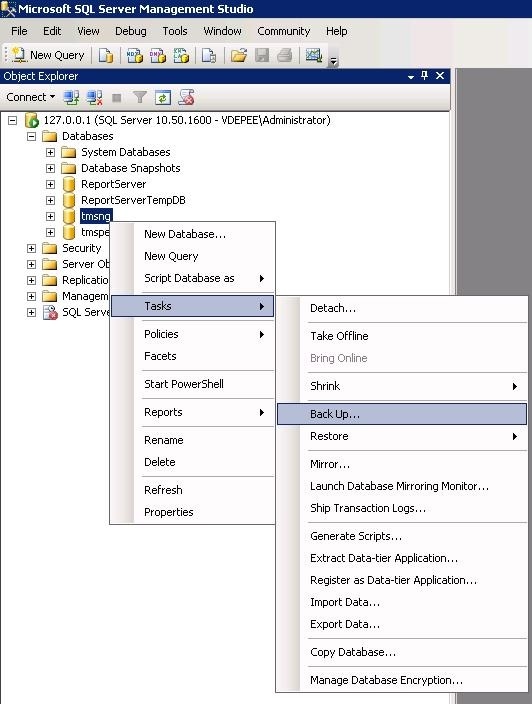 Sur le serveur SQL actuel, ouvrez SQL Management Studio et accédez à la base de données tmsng. Cliquez avec le bouton droit sur la base de données et accédez à Tâches > Sauvegarder...: