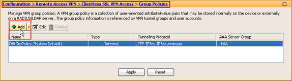 Afin d'attribuer la liste à une stratégie de groupe, choisissez Configuration > Remote Access VPN > Clientless SSL VPN Access > Group Policies, et cliquez sur Add ou Edit.