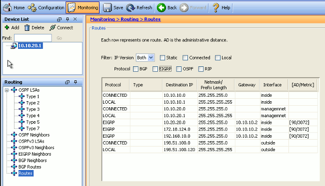 D 10.20.20.0 255.255.255.0 [90/28672] via 10.10.10.2, 0:32:29, inside