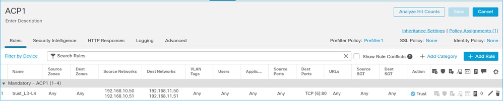 Tenez compte de la règle Prefilter Policy (politique de préfiltre) qui contient une règle Analyze (analyse), comme le montre l’image :