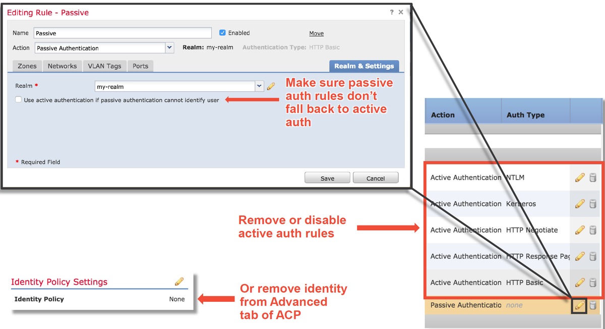 Lorsqu'elle est utilisée dans une stratégie d'identité, l'authentification active peut supprimer le trafic qui doit être autorisé en cas de problème. La fonctionnalité d'authentification active elle-même peut avoir un impact direct sur tout le trafic HTTP/HTTPS, car s'il est déterminé que nous devons authentifier un utilisateur, tout cela se produit uniquement sur le protocole HTTP. Cela signifie que l'authentification active ne doit pas avoir d'impact sur d'autres services réseau (tels que DNS, ICMP, etc.), sauf si vous avez des règles de contrôle d'accès spécifiques qui bloquent en fonction de l'utilisateur et que les utilisateurs ne peuvent pas s'authentifier via les services d'authentification actifs sur le FTD. Cependant, cela ne serait pas un problème direct de la fonctionnalité d'authentification active, mais le résultat est que les utilisateurs ne peuvent pas s'authentifier et ont une politique qui bloque les utilisateurs non authentifiés.