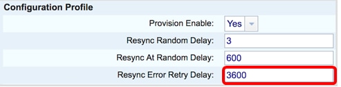 Étape 9. Entrez une valeur dans le champ Resync Error Retry Delay. Cela permet au périphérique d'essayer de resynchroniser après le temps spécifié en secondes chaque fois qu'une opération de resynchronisation échoue en raison de problèmes de serveur, si le fichier téléchargé est endommagé ou qu'une erreur interne se produit. Si ce paramètre est défini sur 0, le périphérique ne se resynchronise pas après une tentative échouée.