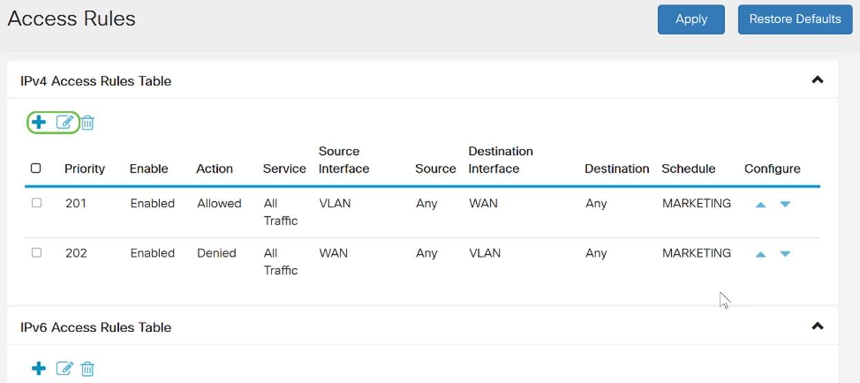 Étape 3. Dans le tableau Règles d'accès IPv4 ou IPv6, cliquez sur Ajouter ou sélectionnez la ligne et cliquez sur Modifier.