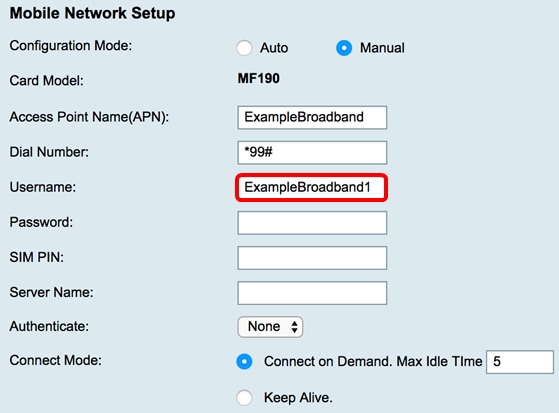 Étape 8. (Facultatif) Dans le champ Nom d'utilisateur, saisissez le nom d'utilisateur fourni par le fournisseur de services de réseau mobile.