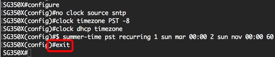 SG350X(config)#no clock dhcp timezoneÉtape 8. (Facultatif) Pour configurer le système de sorte qu'il passe automatiquement à l'heure d'été (DST), saisissez l'une des options suivantes :